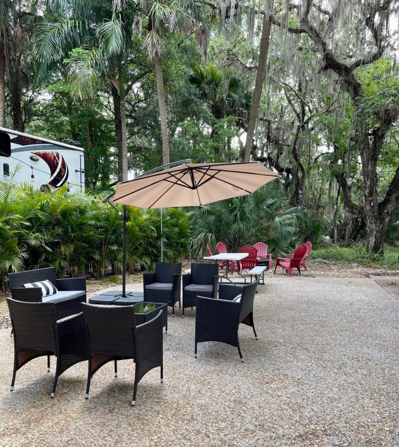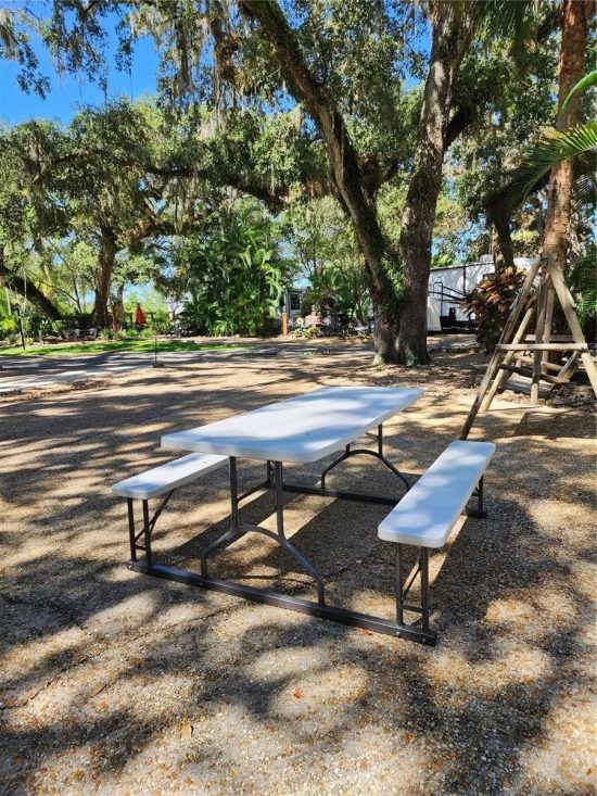 Nestled in the coveted phase 4 of River Ranch RV Resort, this beautiful shaded campsite offers the ultimate blend of tranquility and convenience. With ample modern seating, a cozy wooden swing, and a charming picnic area complete with a fire pit, relaxation is guaranteed. Enjoy the serenity of the wooded surroundings and the privacy of no rear neighbors. Just a short stroll away, you’ll find all the amenities you need, from the refreshing pool to the convenient laundry and bath house. With separate parking spaces for a vehicle and golf cart, every aspect of your stay is tailored for comfort and ease.